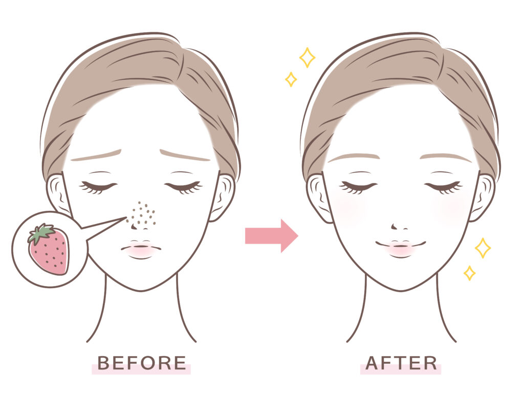 毛穴に残った汚れが空気に触れて酸化すると黒くなり、「いちご鼻」や「ブラックヘッド」と呼ばれる状態になります。